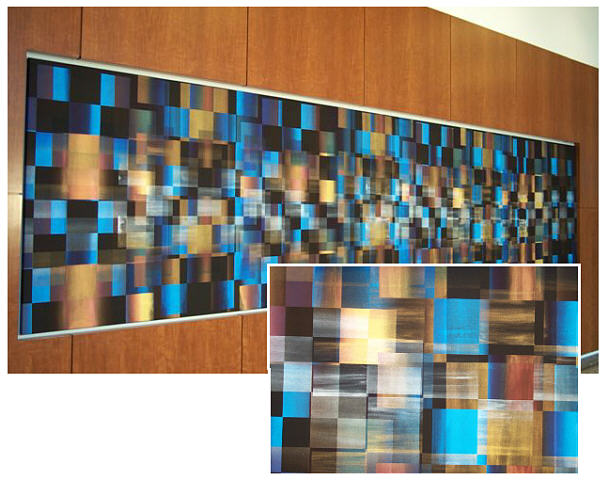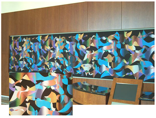 | Another important area of expertise is that the artist, John Spears, likes to create is large-scale commission artwork known as site-specific artwork where the art is meant for a particular interior environment. His inspiration maybe derived from an architectural detail or some other abstract visual that is associated with a particular setting, corporate identity or vision. For example, the atrium for the hi-tech center formerly known as Nabisco he was inspired by its four-story atrium. As in a traditional symphony there are four movements. Here he visually created a visual symphony of four parts, each floor in a different movement. Another example is the new corporation, NeuStar, Inc. and its cutting edge convergence technology. The artist's "Organized Chaos" series already in progress was a natural match to their vision of harnessing the enormous amount of random data they handle into an organized whole. In addition to the aesthetic enhancement the art provides, often acoustical concerns are addressed at the same time. Thus form and function merge into a positive interior environment and for those that may work in those spaces a beneficial result is experience daily. |
